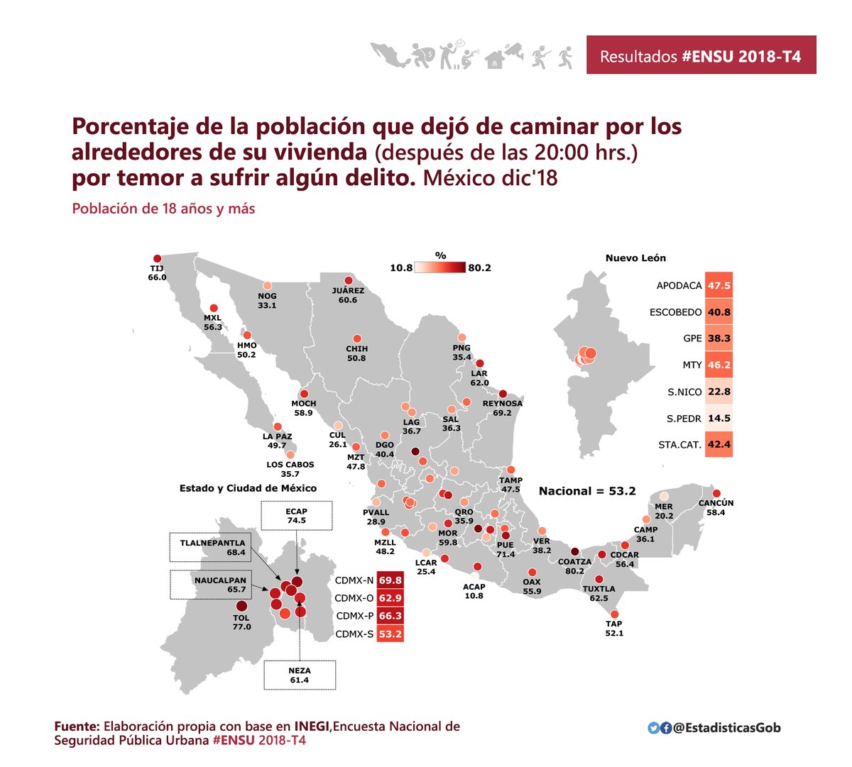 De acuerdo con los resultados del vigésimo segundo levantamiento de la Encuesta Nacional de Seguridad Pública Urbana (ENSU), realizada por el INEGI en la primera quincena de diciembre de 2018, durante ese mes 73.7% de la población de 18 años y más consideró que vivir en su ciudad es inseguro.