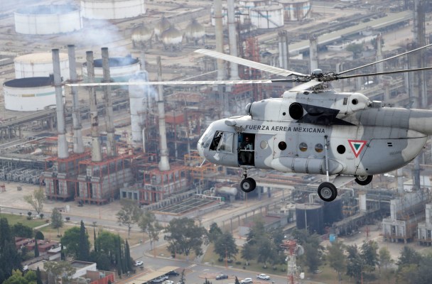 Helicópteros y aviones de la Secretaría de la Defensa sobrevuelan los ductos e instalaciones de Pemex como parte de la lucha contra el robo de hidrocarburos. Están equipados con armas de alto poder para disuadir a los huachicoleros.