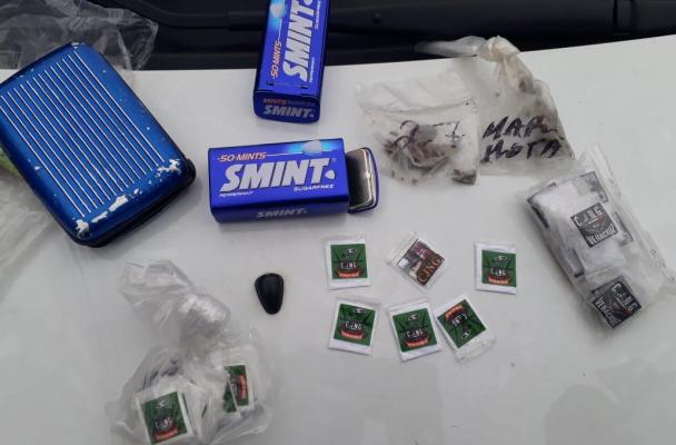 Tras la inspección, se les aseguró una mochila tipo mariconera, en cuyo interior había un aproximado de 50 dosis de lo que parece ser cristal y cocaína.