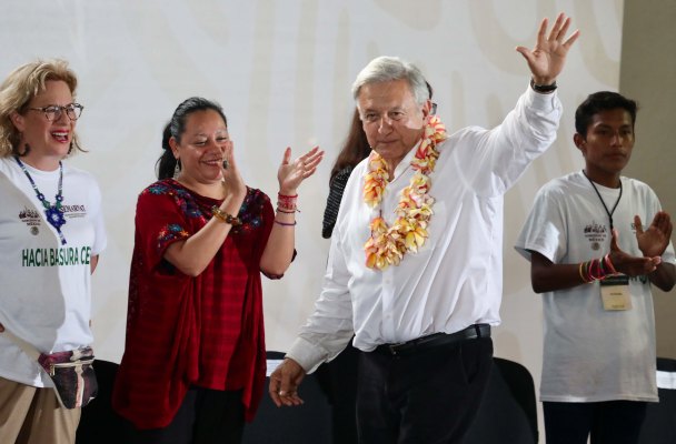 El presidente Andrés Manuel López Obrador presenta el programa Hacia basura cero en el Instituto Tecnológico de Minatitlán. Lo acompañan Josefa González, titular de Semar; y María Luisa Albores, secretaria de Sedesol.
