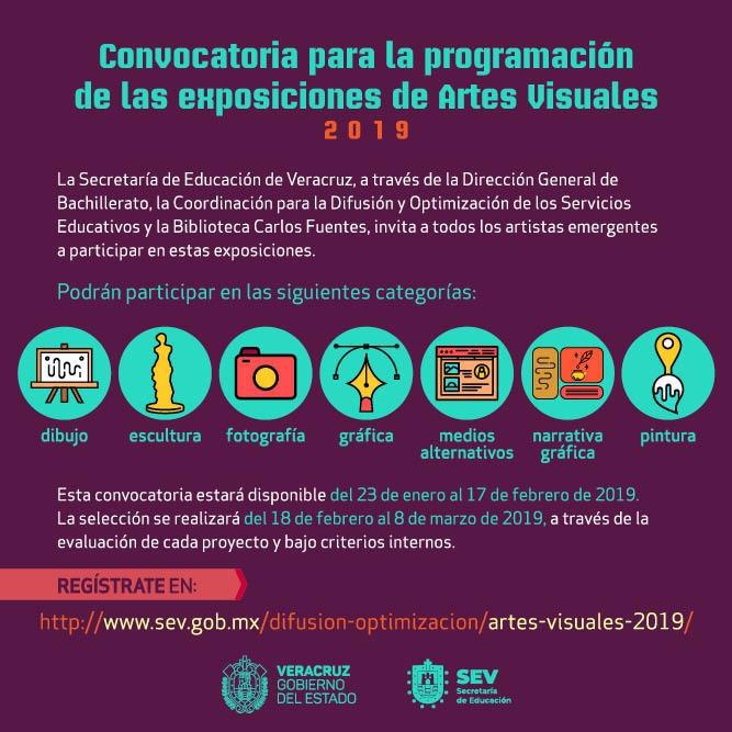 La Secretaría de Educación de Veracruz (SEV), a través de la Coordinación para la Difusión y Optimización de los Servicios (CDOSE), la Dirección General de Bachillerato (DGB) y con apoyo de la biblioteca “Carlos Fuentes”, continúa invitando a los artistas emergentes para que participen en las exposiciones de Artes Visuales 2019.