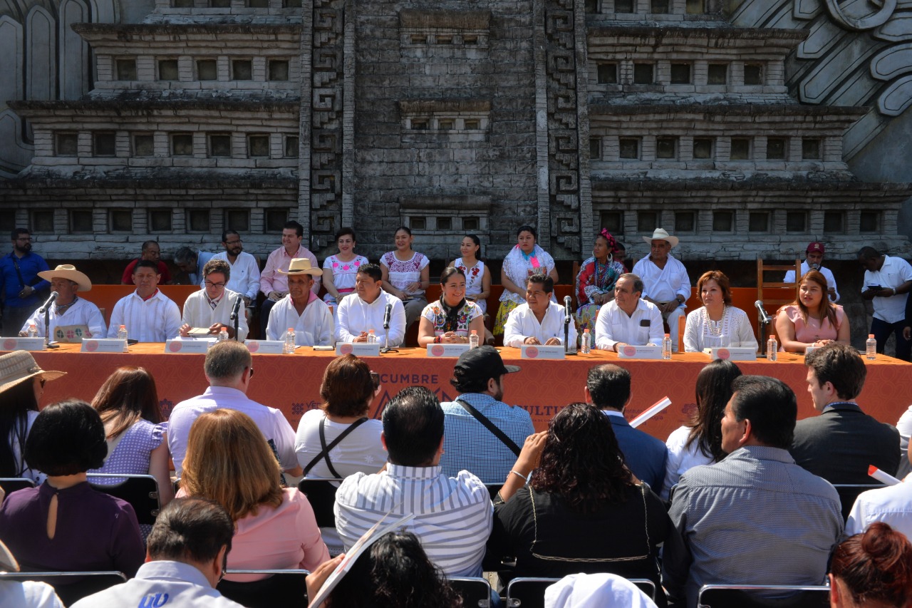 “Vienen seis años de Cumbre Tajín con mucha fuerza, mucha visión; pero, sobre todo, con mucha humildad de parte del Gobierno”, expresó frente al mural del maestro Teodoro Cano.