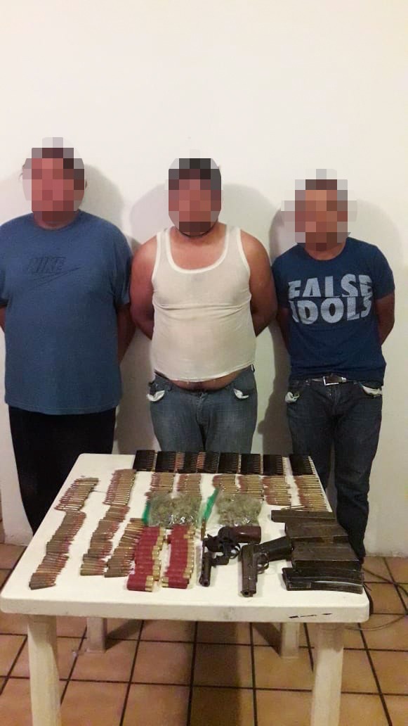 Como parte del Operativo en Bares y Cantinas, elementos de la Secretaría de Seguridad Pública (SSP) detuvieron a tres individuos por encontrarlos en posesión de armas de fuego, cartuchos útiles de diferentes calibres y sustancias nocivas para la salud.