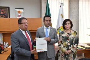• El presidente del Congreso del Estado, diputado José Manuel Pozos Castro, recibe este documento del titular de la Sefiplan, José Luis Lima Franco.