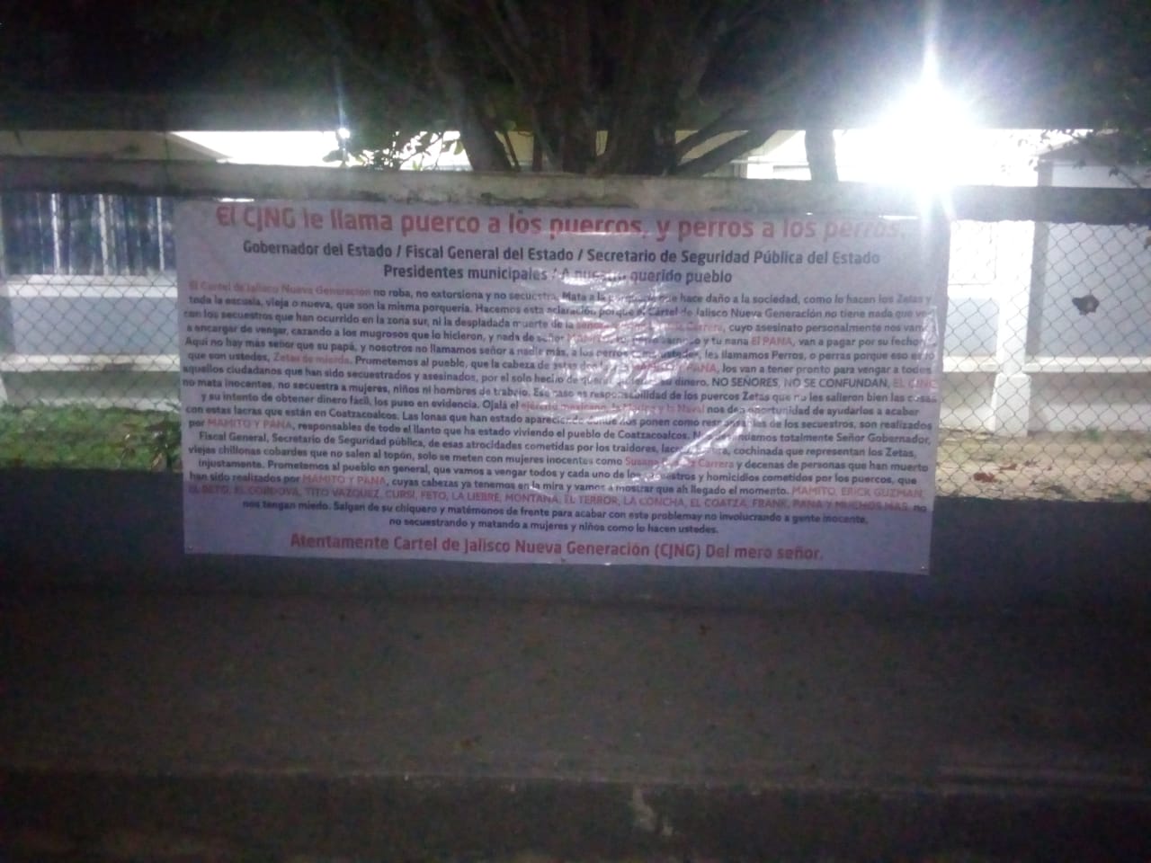 Debido a las pequeñas letras y la falta de alumbrado, fue imposible leer lo que decía, sin embargo con letras rojas se pudo constatar que fue firmada por un grupo la delincuencia organizada, por lo que elementos de la policía municipal y Estatales llegaron al lugar para retirar la lona.