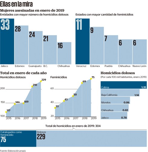 CIUDAD DE MÉXICO, febrero 27 (EL UNIVERSAL).- Jalisco y Veracruz encabezan la lista de estados con mayor número de homicidios perpetrados en contra de mujeres en lo que va de 2019. Gráfico: Agencia EL UNIVERSAL