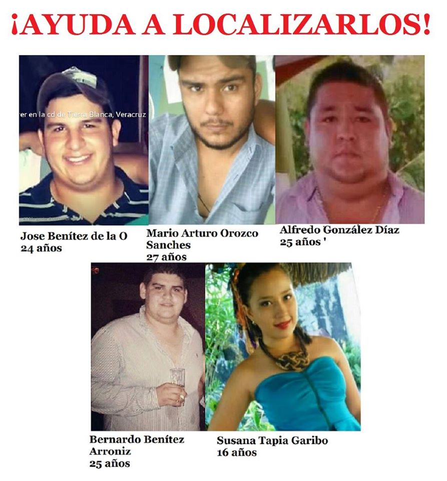 Desde el pasado 11 de enero, se reportó la desaparición de cinco jóvenes que presuntamente fueron detenidos por policías estatales en el municipio de Tierra Blanca. Hasta el momento se desconoce el paradero de José Benítez de la O, de 24 años; Mario Arturo Orozco Sánchez, de 27; Alfredo González Díaz, de 25; Bernardo Benítez Arróniz, de 25, y Susana Tapia Garibo, esta última de 16 años.