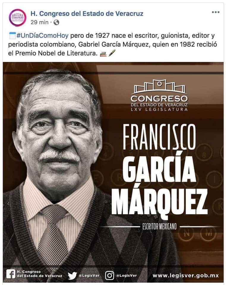En las redes sociales del Congreso de Veracruz aparece una imagen con la información correcta del autor de «Cien años de soledad».