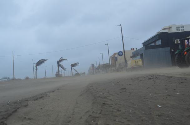 Aunque se había pronosticado lluvia, no se ha precipitado nada… solo leves nubarrones. La arena de la playa vuela hasta dentro de las avenidas.