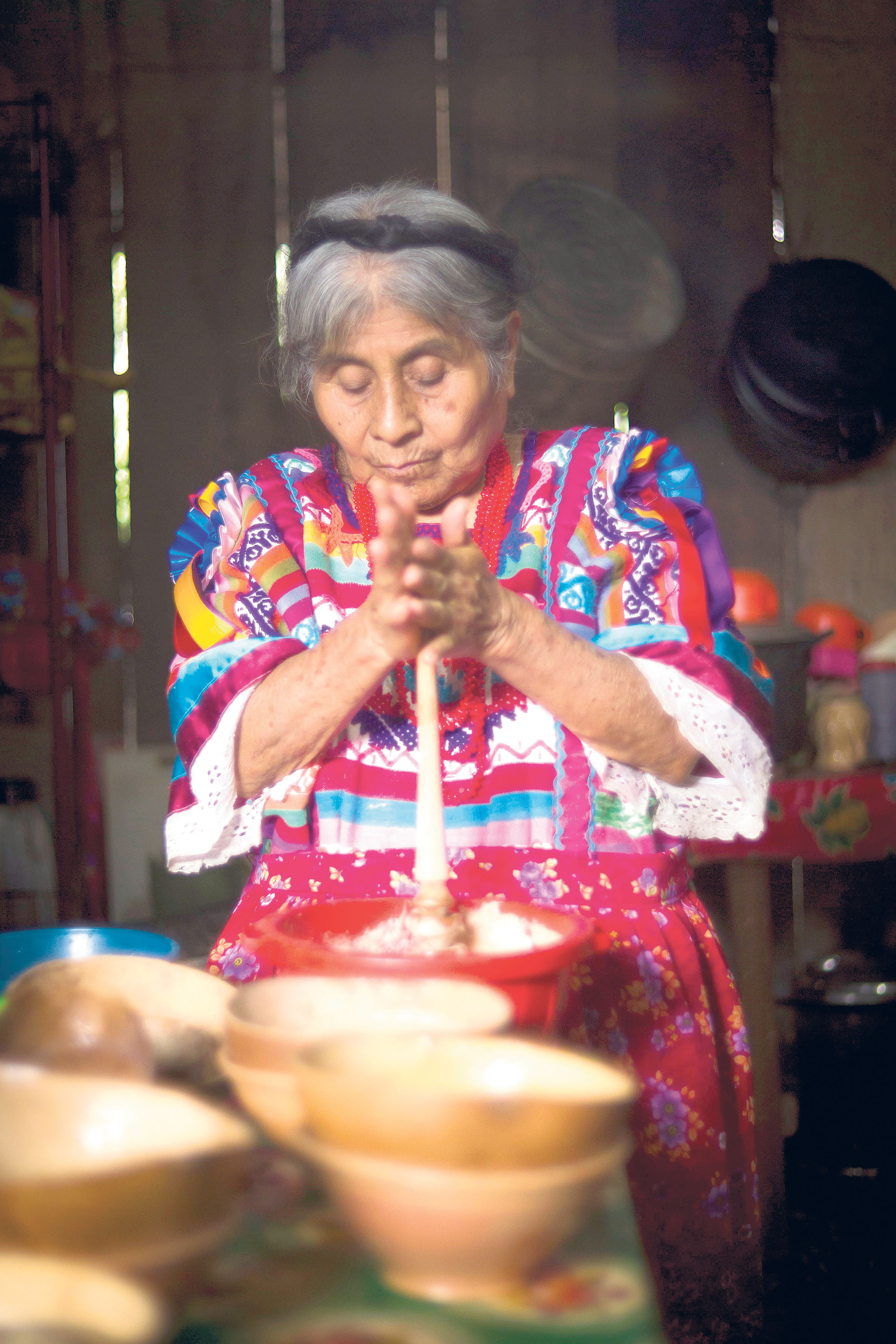 La pequeña anciana domina con maestría el vaivén en el metate, donde muele el cacao tostado un día antes, al cual se le agrega canela y un trozo de cocolmeca, un bejuco que también crece en el campo.