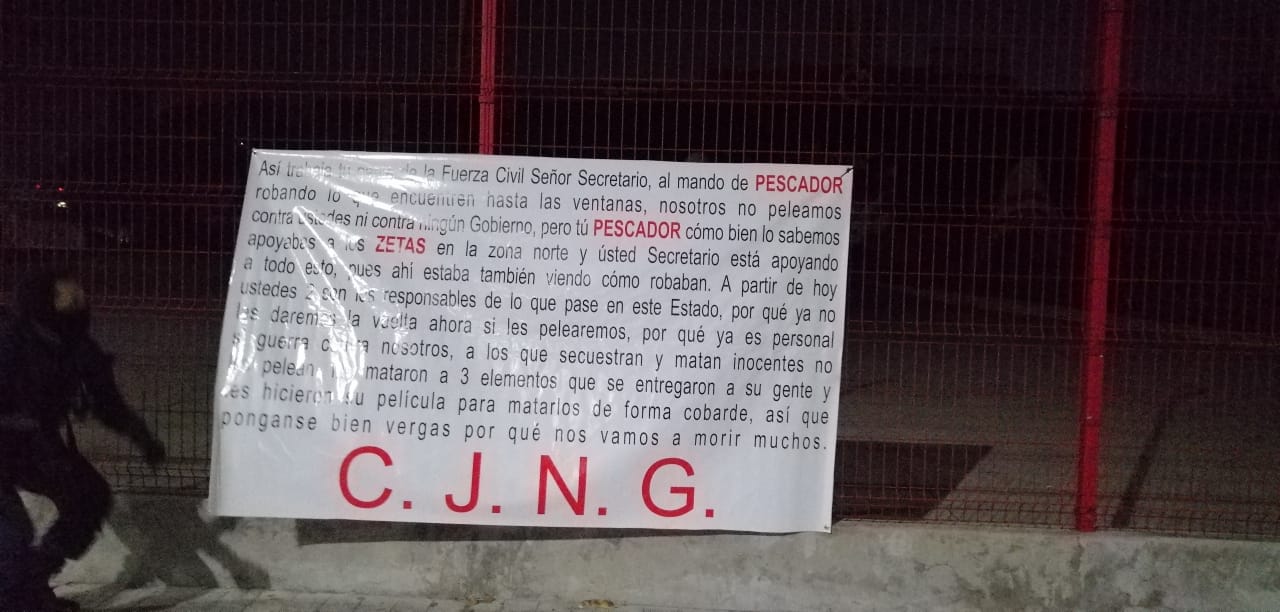 En estas lonas, podía leerse que la amenaza va dirigida hacia el mando de la SSP con clave «Pescador» quien presuntamente realizó el decomiso de armamento y equipo táctico en el municipio de Tierra Blanca horas atrás, así como por los tres sujetos abatidos en Misantla.