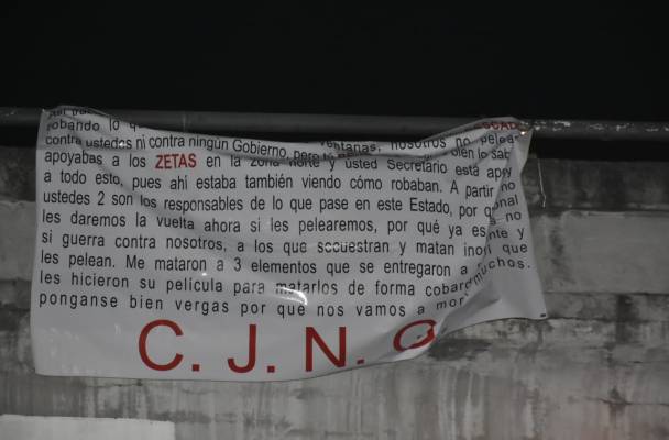 La última de estas «narcomantas» fue puesta en el distribuidor vial que atraviesa la autopista Veracruz-Cardel, a la altura del denominado kilómetro 13.5 y contenía exactamente el mismo mensaje.