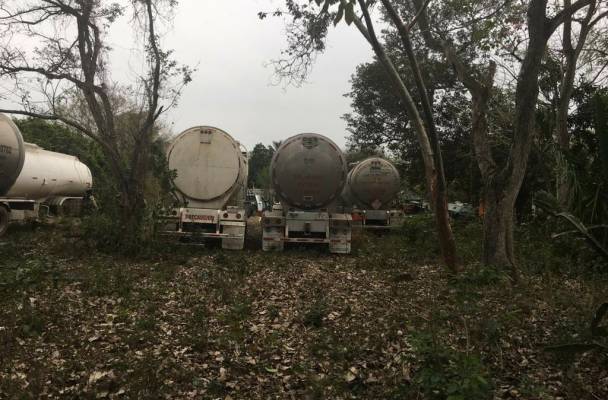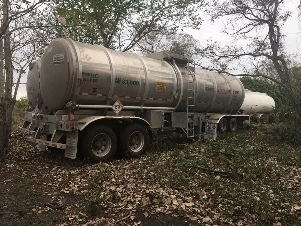 Las secretarías de Seguridad Pública (SSP) y de la Defensa Nacional (SEDENA) recuperaron dos camiones torton, seis semirremolques cisterna para combustible, una caja seca y un Dolly; en un terreno baldío de la localidad Joachín, en este municipio.