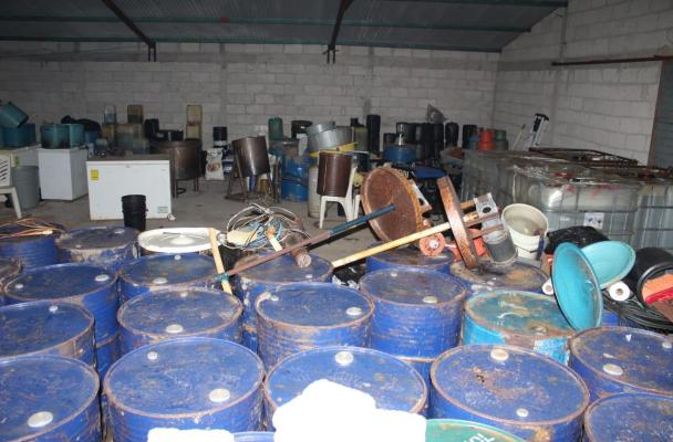 Por tal motivo, se implementó un fuerte operativo de búsqueda que derivó en el aseguramiento de dos inmuebles, en los cuales había dos vehículos abandonados, contenedores, sustancias químicas y tres máquinas de corte industrial, de gran tamaño y con marcador de temperatura.