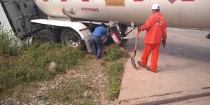 Esta madrugada de sábado, un camión auto tanque que transportaba productos peligrosos se salió de la carretera del circuito industrial por el Complejo Cangrejera luego que el conductor recibiera amenazas de asalto.