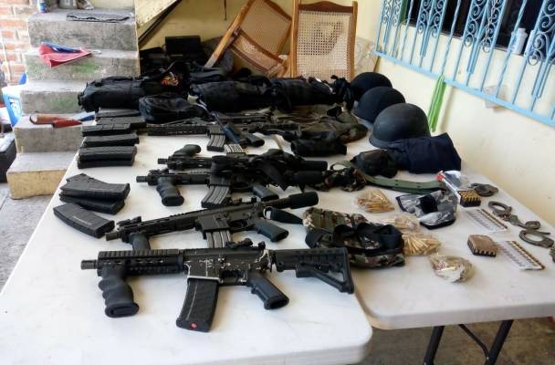 Al arribar personal ministerial al inmueble, aseguraron nueve armas largas y una corta; tres armas cortas de postas; 18 cargadores para armas largas abastecidos con 30 cartuchos cada uno; una caja con 17 cartuchos útiles calibre 45 mm; siete chalecos balísticos; cuatro bolsas con cartuchos .223; una caja con cartuchos 38 súper; tres esposas metálicas; tres cascos Kevlar; un par de rodilleras, un radio portátil y una camisola verde con las siglas CJNG.