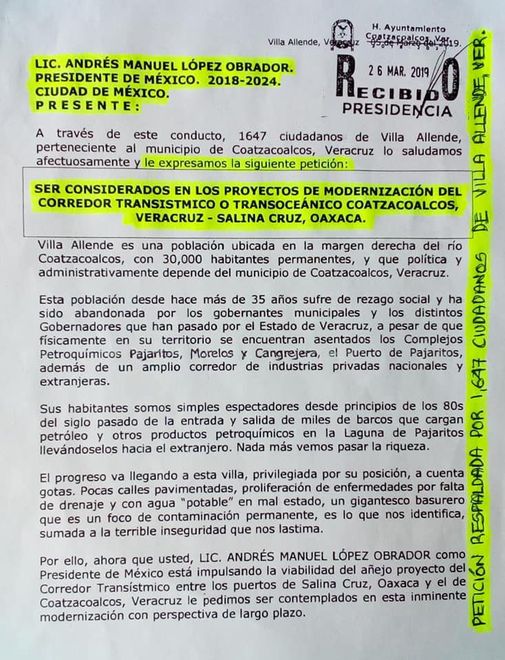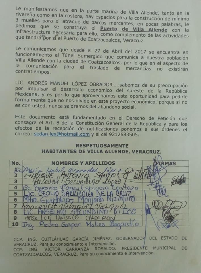 «En la parte marina de Villa Allende tanto en la ribereña como en la costera, hay espacios para la construcción de mínimo tres muelles para el atraco de barcos mercantes, en pocas palabras, le pedimos que se construya el Puerto de Villa Allende con la infraestructura necesaria para ello, como complemento de las actividades que tendrá por si el Puerto de Coatzacoalcos», manifestaron los habitantes, en su misiva al presidente de México, Andrés Manuel López Obrador.