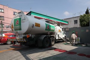 una pipa de Pemex al abastecer de combustible a una gasolinera.