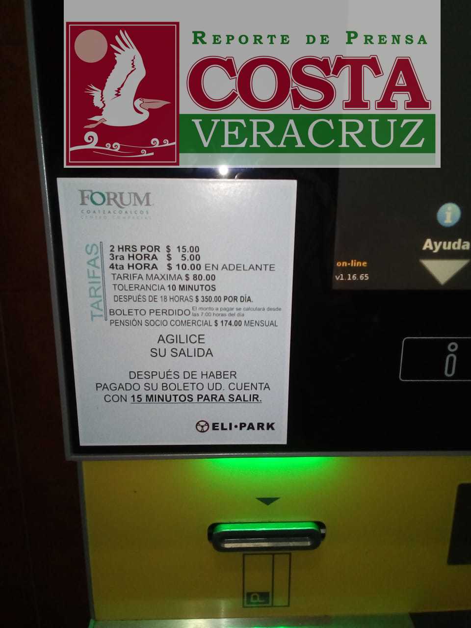 La plaza comercial más importante de la región, Plaza Forum Coatzacoalcos, ubicada en avenida Universidad en la colonia El Tesoro, sorprendió a sus clientes con un anunció en el incremento en sus tarifas. Al llegar a la plaza un nuevo letrero indica las tarifas, las cuales aplican a partir de hoy.
