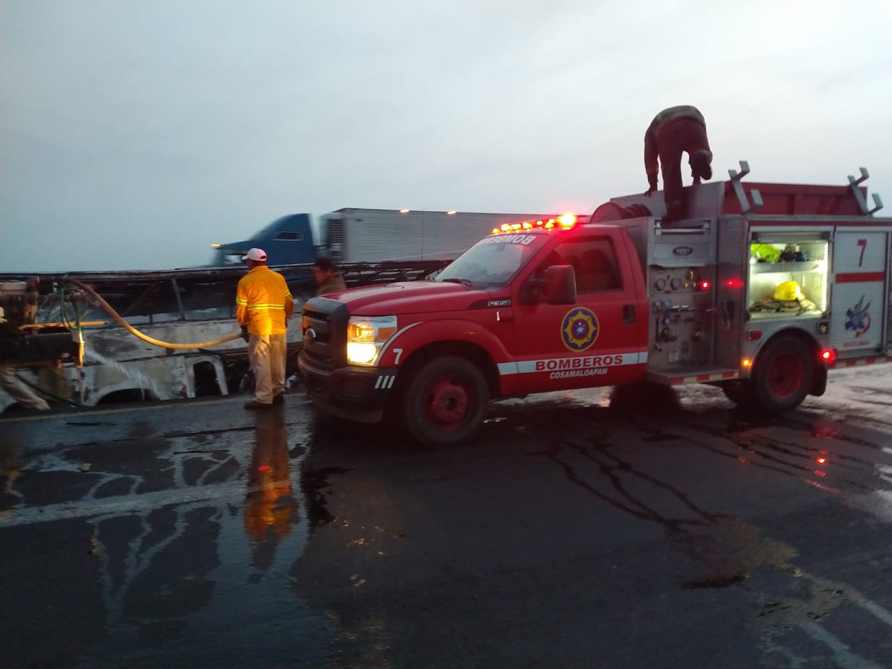 Mientras que los elementos del cuerpo de bomberos de Cosamaloapan, realizaron su heroica labor, la ambulancia de CAPUFE y Protección Civil auxiliaron a las personas trasladándolas a la clínica del IMSS de Cosamaloapan, donde están siendo atendidos, mientras que la Fiscalía realizó los peritajes correspondientes una vez que fueron sofocadas las llamas, para dar fe de la muerte del Conductor del cual se desconocen sus generales.