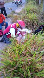 Debido a que el impacto fue muy fuerte contra la res, a este motociclista se le rompió su casco.