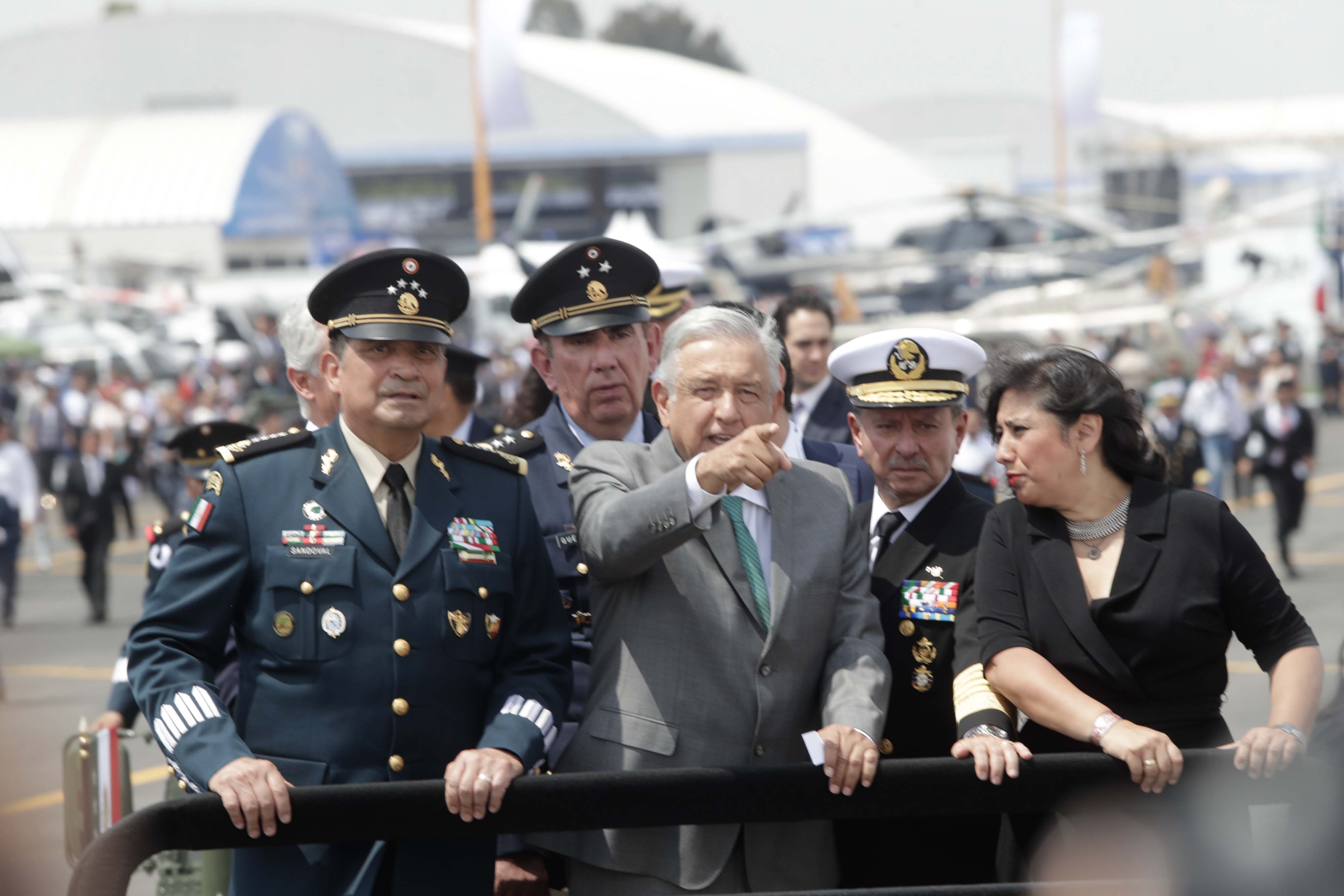 El titular de la Secretaría de la Defensa Nacional, Luis Cresencio Sandoval; el presidente, Andrés Manuel López Obrador; y el titular de la Secretaría de Marina, José Rafael Ojeda Durán; y la titular de la Secretaría de la Función Pública, Irma Eréndira Sandoval; durante la inauguración de la Feria Aeroespacial de México este 24 de abril de 2019 en la base militar de Santa Lucía.
