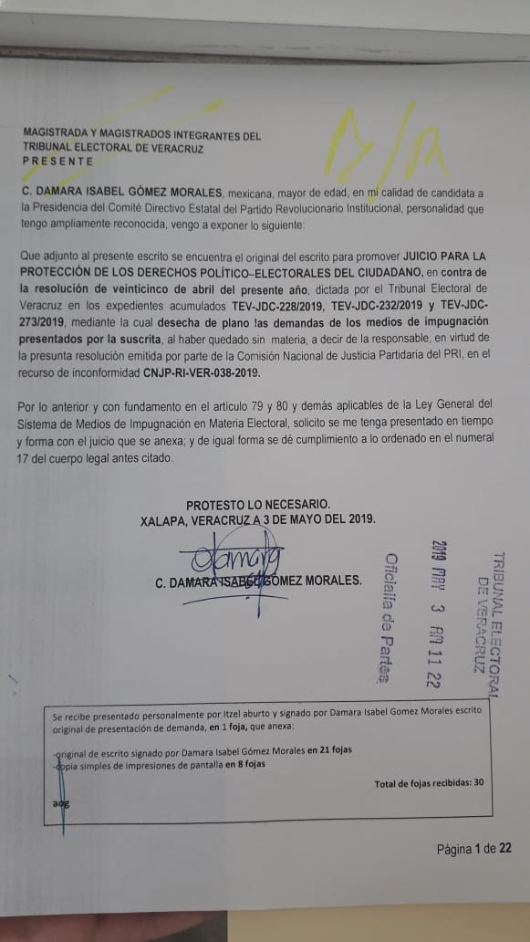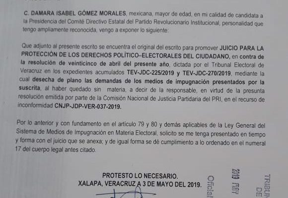 Por lo que este jueves, Damara Gómez, presentó la impugnación ante las instancias partidistas.