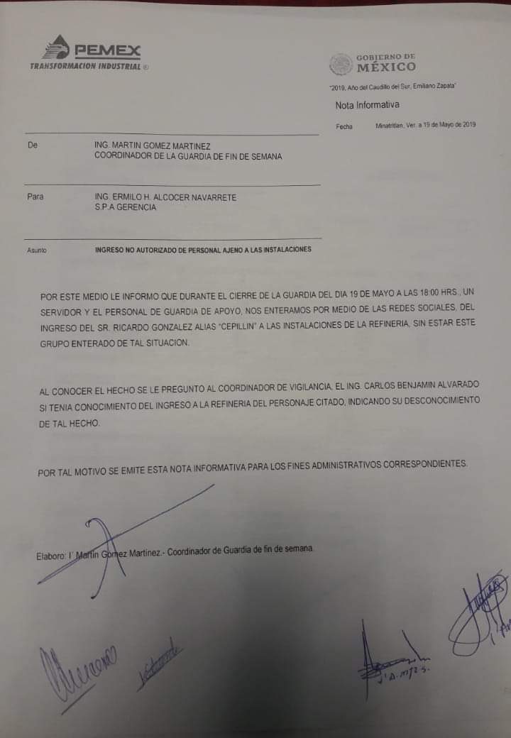«Por este medio le informo que durante el cierre de la guardia del día 19 de mayo a las 18 horas un servidor y el personal de guardia de apoyo nos enteramos por medio de las redes sociales del ingreso del señor Ricardo González Alias «El Cepillín» a las instalaciones a la Refinería, sin estar este grupo enterado de tal situación-