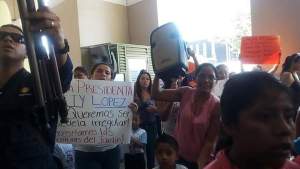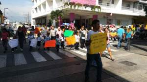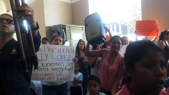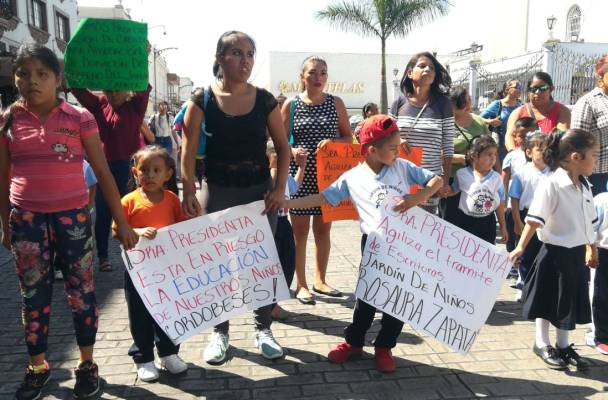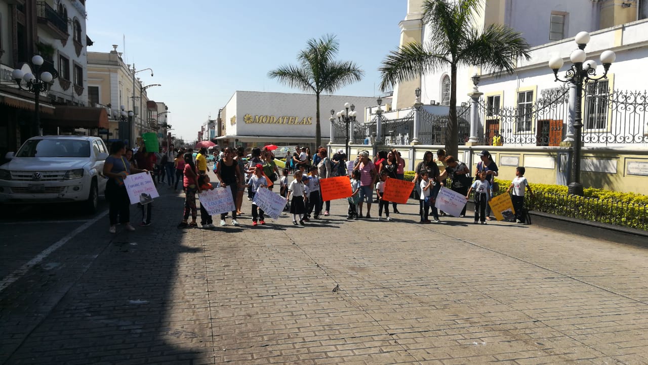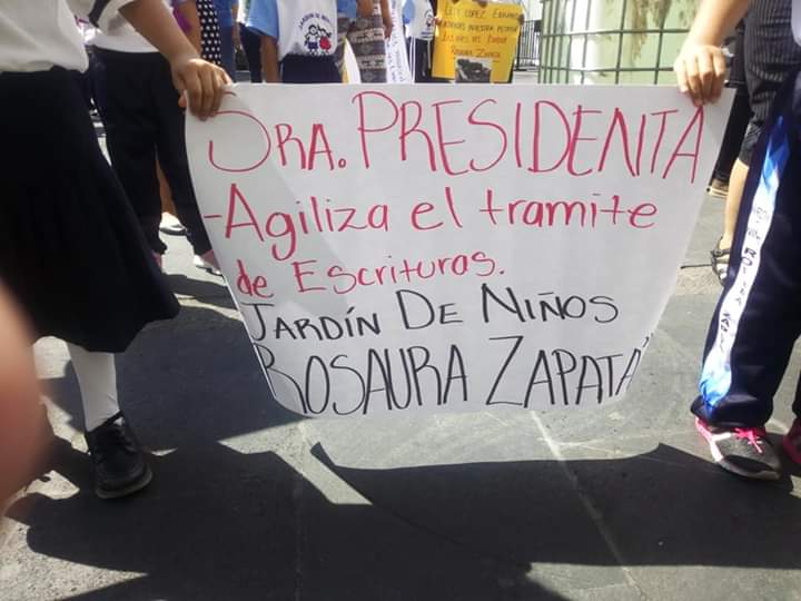 Tras marchar por las principal, padres de familia y alumnos y maestros del jardín de niños “Rosaura Zapata”, se apostaron en el Palacio municipal para exigir a la alcaldesa, Leticia López Landero, la donación del terreno donde se ubica la institución.
