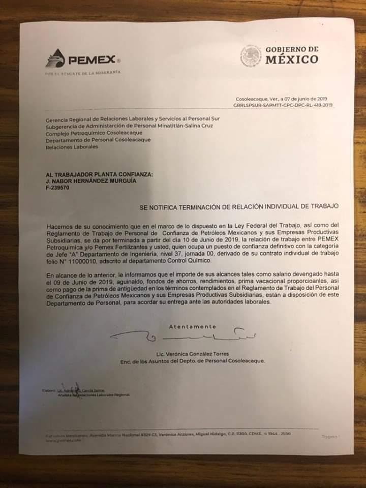 El pasado 7 de junio de este año, mediante un oficio foliado, PEMEX informó al trabajador de confianza J. Nabor Hernández Murguía ( categoría Jefe A nivel 37 jornada cero) que ya será despedido de la empresa petrolera del país.