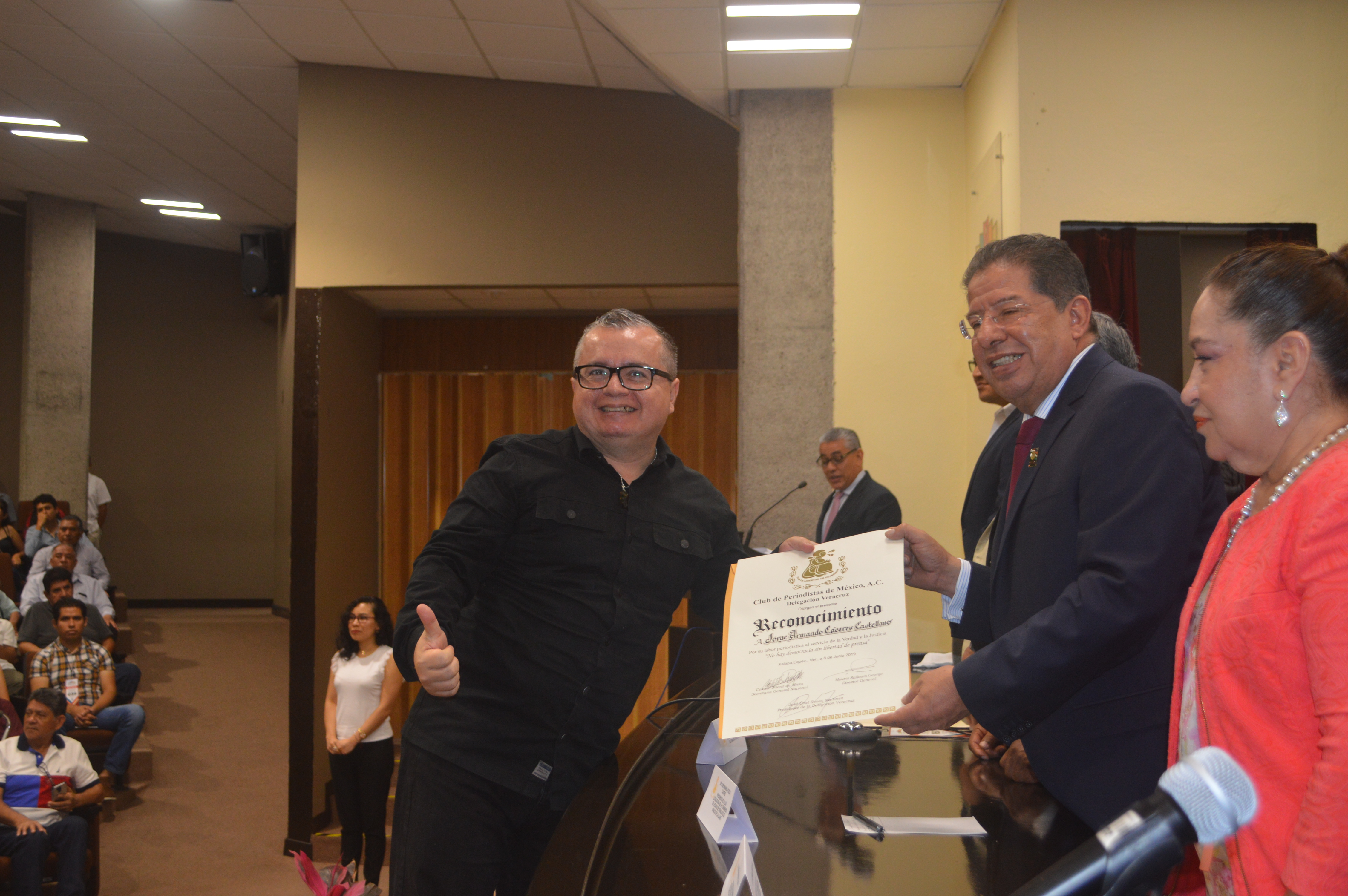 El Club de Periodistas entregó el Premio Estatal de Periodismo 2019 al licenciado Jorge Cáceres por su trabajo de reportaje de investigación «Yunes no hizo nada por la Zona Económica Especial Coatzacoalcos» que es un texto que relata el incumplimiento de obra pública del Gobierno del Estado en la administración panista para la creación de un parque industrial.
