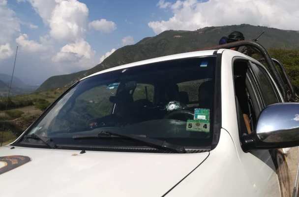 Inmediatamente los uniformados informaron a la patrulla que los escoltaba, para intervenir a los intrusos, pero los 4 ocupantes de la camioneta accionaron sus armas contra los guardianes de la ley, logrando impactar hasta en tres ocasiones al vehículo policial.
