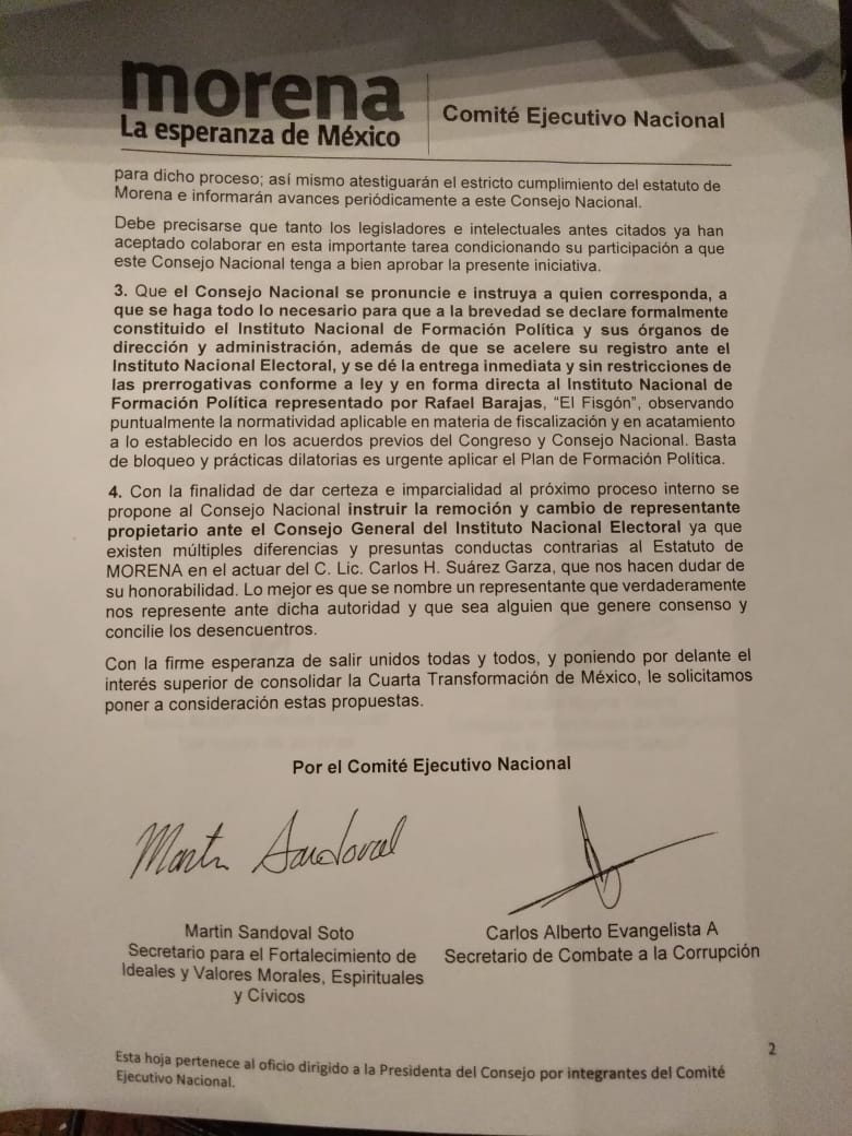 Aunque no los mencionó, parte de este «pseudo CEN» de Morena está integrado por Carlos Evangelista, secretario de Combate a la Corrupción, y Hugo Lino Martínez, quien se ostenta como parte del CEN, pero ocupa el cargo de delegado del partido en Veracruz.