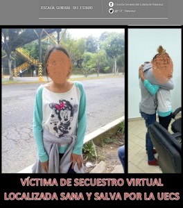 En menos de 24 horas, la Unidad Especializada en Combate al Secuestro (UECS) localizó sana y salva, mediante trabajos de inteligencia, a una menor de 12 años de edad, quien era víctima de secuestro virtual.
