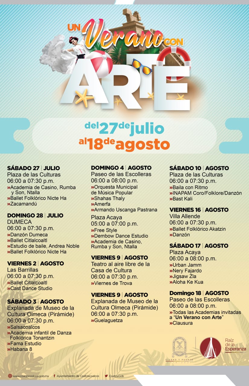 • Habrá eventos artísticos y culturales del 27 de julio al 18 de agosto en diversos sitios turísticos de Coatzacoalcos durante los sábados y domingos