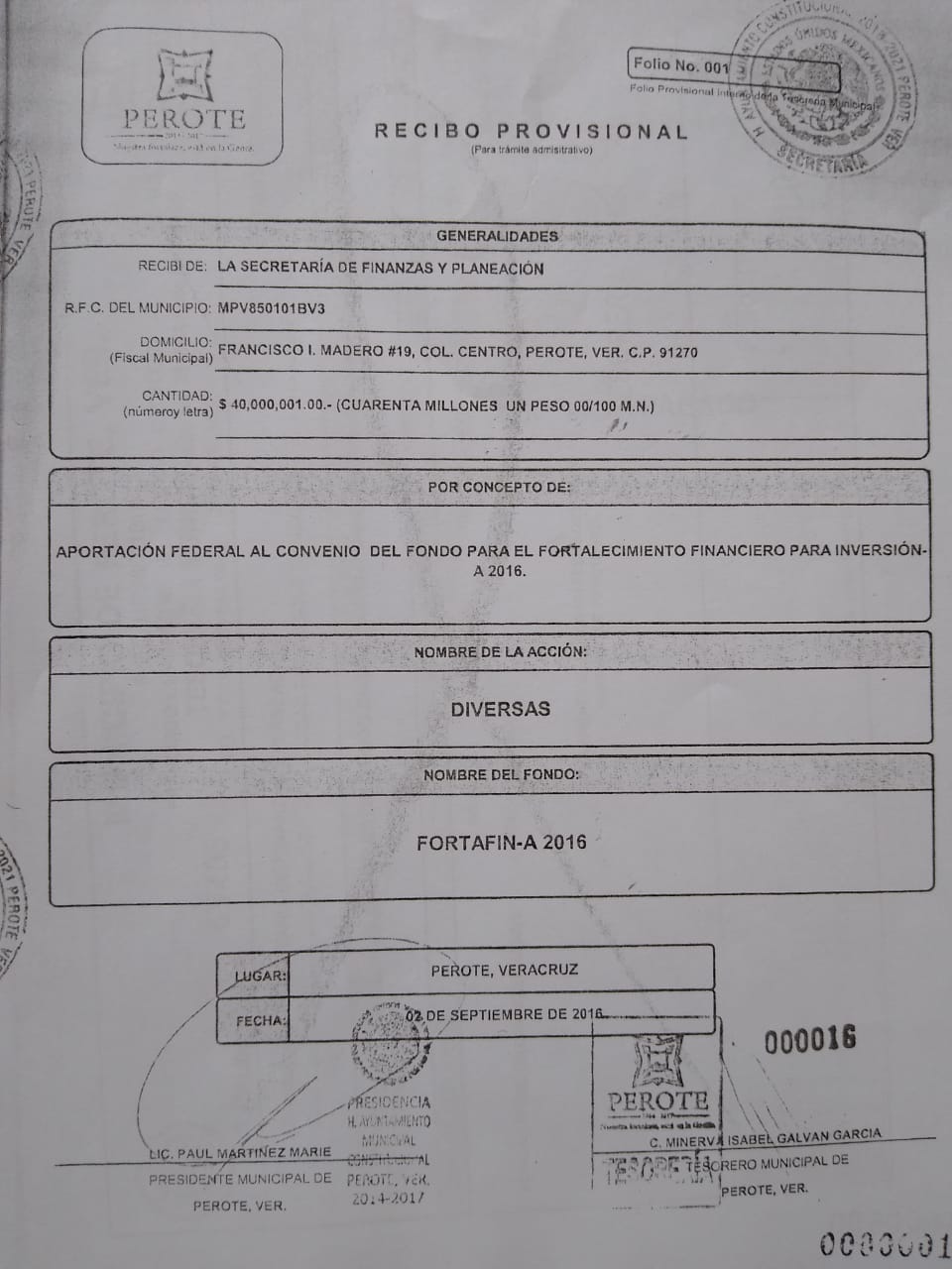 El recibo fue firmado por el entonces presidente municipal, Paul Martínez Marié el día 02 de septiembre de 2016; pero una semana después, el 07 de septiembre, en la Tesorería Municipal se reportó haber recibido los 40 millones de pesos, según consta en el oficio número 65405 del año 2016.