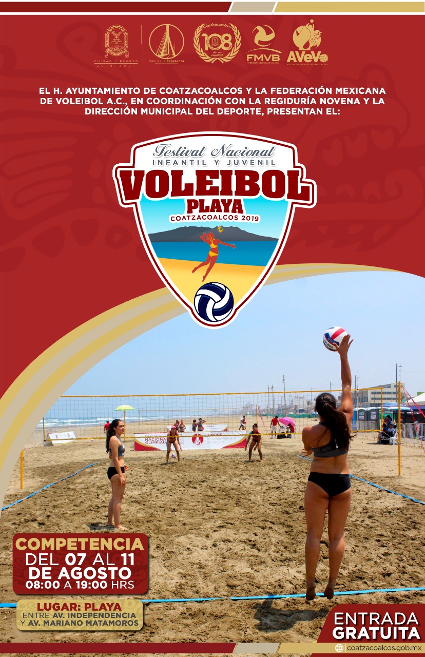 Como parte de los festejos del 108 Aniversario de la Elevación de Villa a Ciudad, el Gobierno de Coatzacoalcos y la Federación Mexicana de Voleibol, a través de la Regiduría Novena a cargo de Lenis Pauling Aparicio Ambrosio y la Dirección Municipal del Deporte presentaron el “Festival Nacional Infantil y Juvenil Voleibol Playa 2019”.