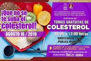 El Gobierno Municipal a través de la Dirección de Salud Pública Municipal, hace una atenta invitación a la ciudadanía en general para que asistan este próximo 16 de agosto en sus instalaciones ubicadas en la Avenida Rodríguez Malpica Nº 412 altos, Colonia Centro, en horario de 9:00 a 13:00 horas, para realizarse estudios de colesterol de forma gratuita.