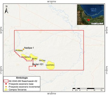 En el escenario base, la petrolera invertiría 10.2 millones de dólares, donde contempla la perforación del pozo Bedel-101, que representaría el 91 por ciento de los recursos, mientras que el 7.0 por ciento sería para geología y el 2.0 por ciento en gastos generales.