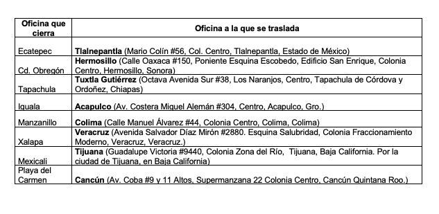 En la Ciudad de México, la oficina que cierra es la Sur, trasladando la atención a consumidores a las oficinas Oriente (Azafrán #18, 1er piso, Col. Granjas México Centro, Alcaldía Iztacalco).