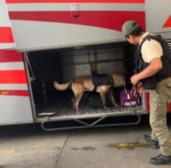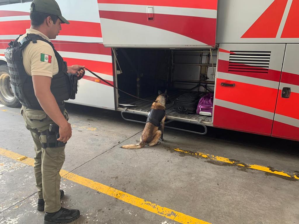 Con el apoyo del agente canino K9, se localizó en el área de equipaje de un autobús de pasajeros una maleta negra que contenía bolsas de plástico color azul, con hierba verde seca, similar a la marihuana y con un peso de cinco kilos.
