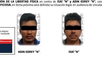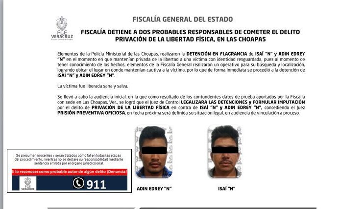 Elementos de la Policía Ministerial de las Choapas realizaron la detención en flagrancia de Isaí «N» y Adin Edrey «N» en el momento en que mantenían privada de la libertad a una víctima con identidad resguardada pues al momento de tener conocimiento de los hechos, elementos de la Fiscalía General realizaron un operativo para su búsqueda y localización, logrando ubicar el lugar en donde mantenían cautiva a la víctima, por lo que de forma inmediata se procedió a la detención de Isaí «N» y Adin Edrey «N»
