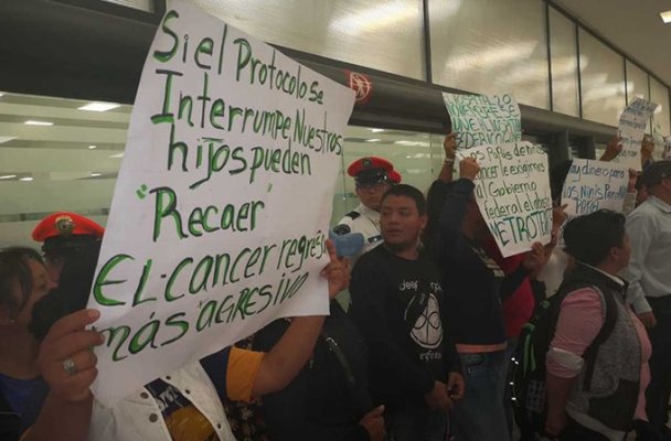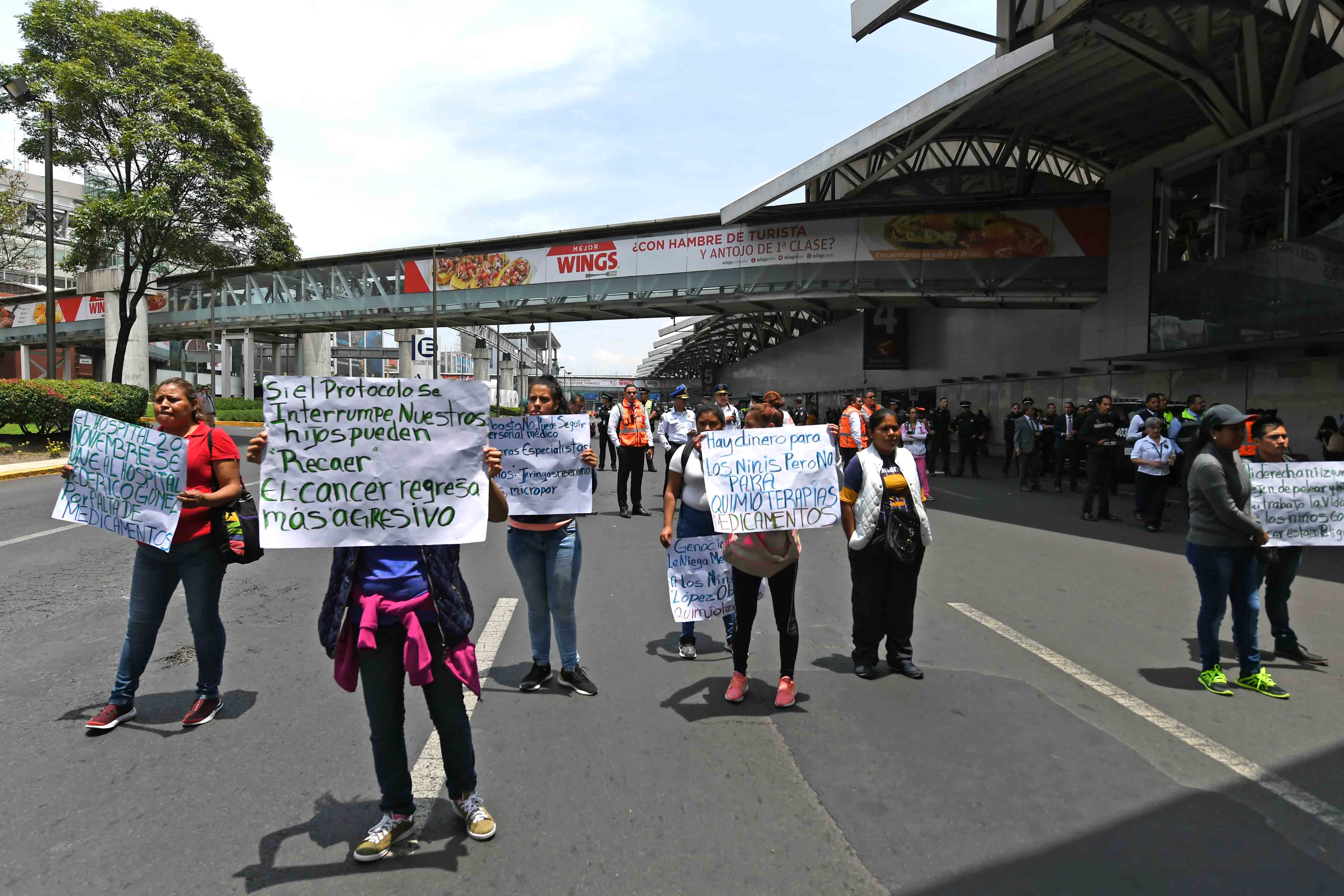 Papás y familiares de niños con cáncer bloquean los accesos de la Terminal 1 del Aeropuerto Internacional de la Ciudad de México (AICM) para exigir al gobierno federal los atiendan con quimioterapias y medicamentos.