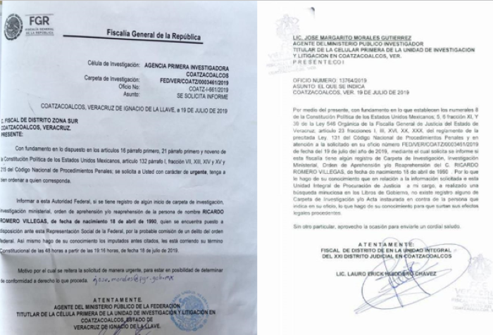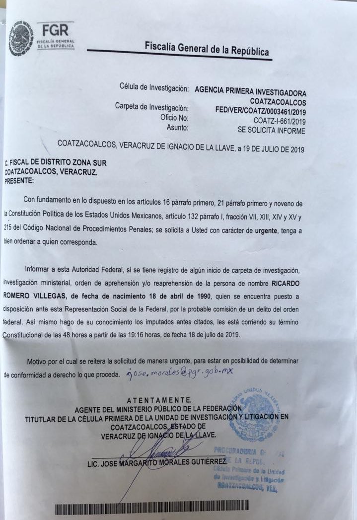 El oficio señala que por la detención del 18 de julio se inició la Carpeta de Investigación FED/VER/0003461/2019 de la Unidad de Investigación y Litigación en Coatzacoalcos de la Delegación Estatal de la Fiscalía General de la República.