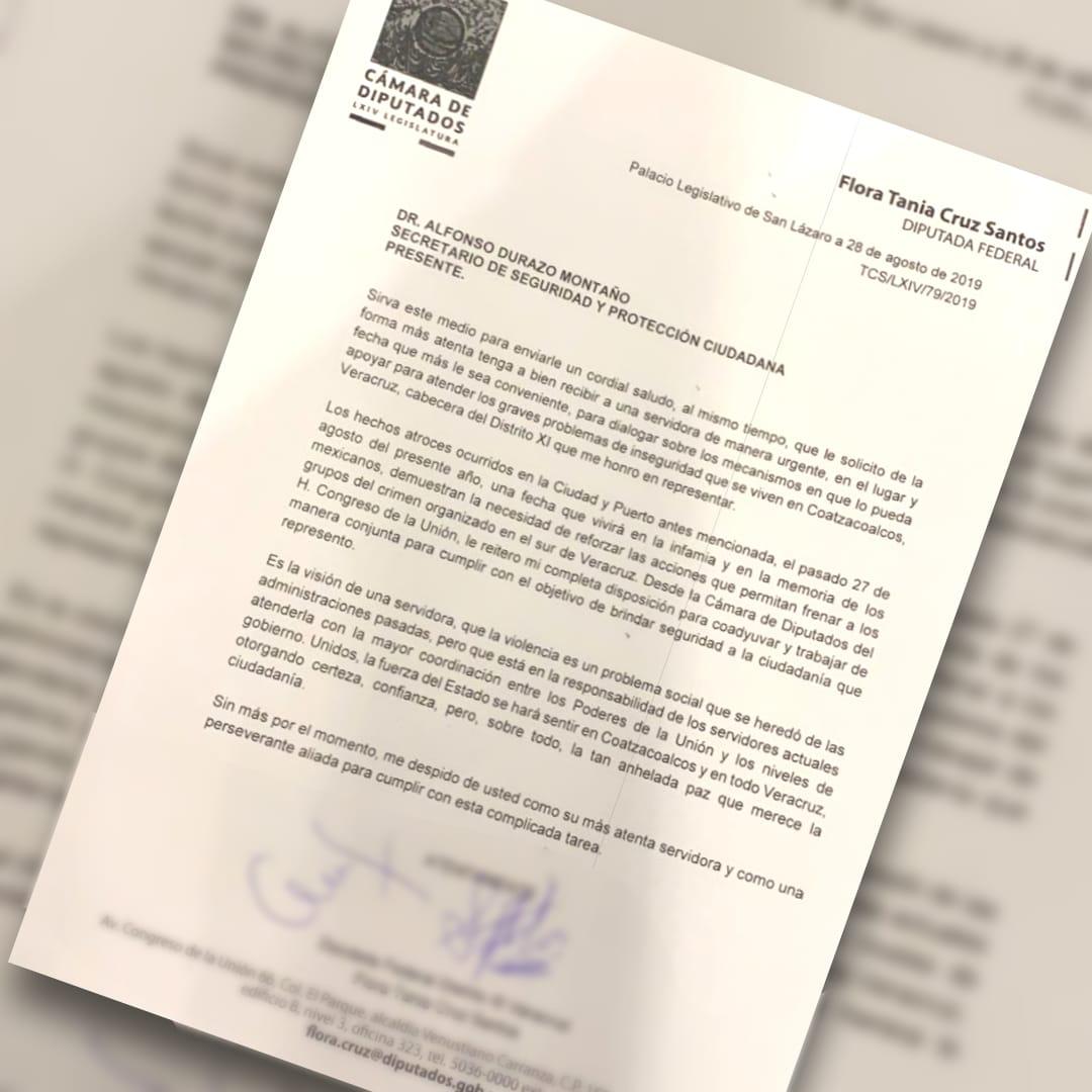La mañana de este viernes la diputada federal Tania Cruz Santos se presentó ante el Secretario de Seguridad y Protección Ciudadana de Gobierno de México el Dr. Alfonso Durazo Montaño, con la firme convicción de solicitarle su intervención directa ante los hechos de violencia que se han presentado en los últimos días en el municipio de Coatzacoalcos.