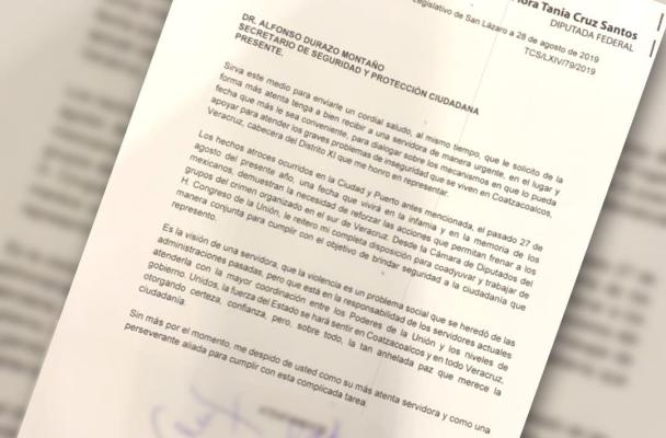 Tania Cruz, aprovechó la reuniones plenarias del Grupo Parlamentario de Morena para entregarle una solicitud por escrito al funcionario federal, en el que le pide un diálogo directo para tratar la imperante necesidad de acciones contundentes que permitan hacer prevalecer un entorno de seguridad así como el estado de derecho en Coatzacoalcos.