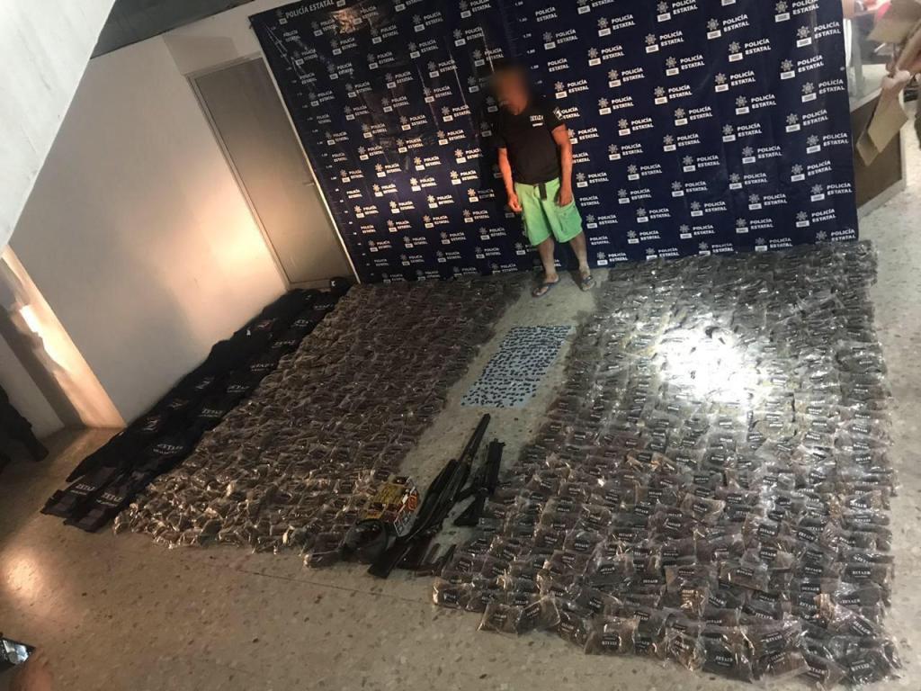 Durante este domingo fue asegurado por elementos de Seguridad Pública, un sujeto a quien se le decomisó 1 mil dosis de hierba cannabis, 300 dosis de estupefaciente conocida como el crystal, así como todo un arsenal con armas de fuego y un vehículo con reporte de robo.