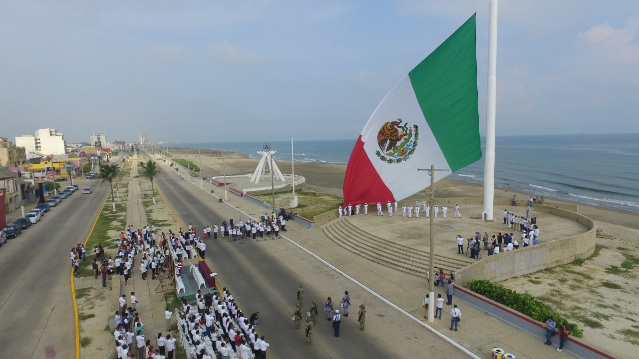 En una emotiva ceremonia cívica, donde la Lic. Claudia Terán leyó las efemérides de la semana por parte de la Dirección de Educación, se llevaron a cabo los Honores a nuestro Lábaro Patrio y el izamiento de la Bandera Monumental, en el Malecón Costero.
