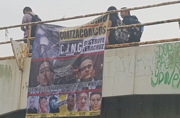 Esta mañana de martes apareció una narcomanta con rostros de líder del CJNG y del ex fiscal en un puente peatonal frente al campus UV de Coatzacoalcos
