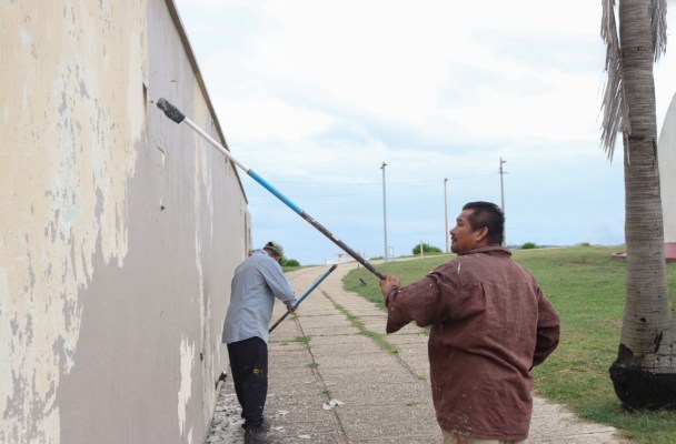 La plaza, que tiene una dimensión de 100 metros de longitud por 100 metros de ancho, ha requerido la utilización de 20 personas, distribuidas en varias cuadrillas que también están raspando y dejando los muros de la barda perimetral, lista para ser pintada.